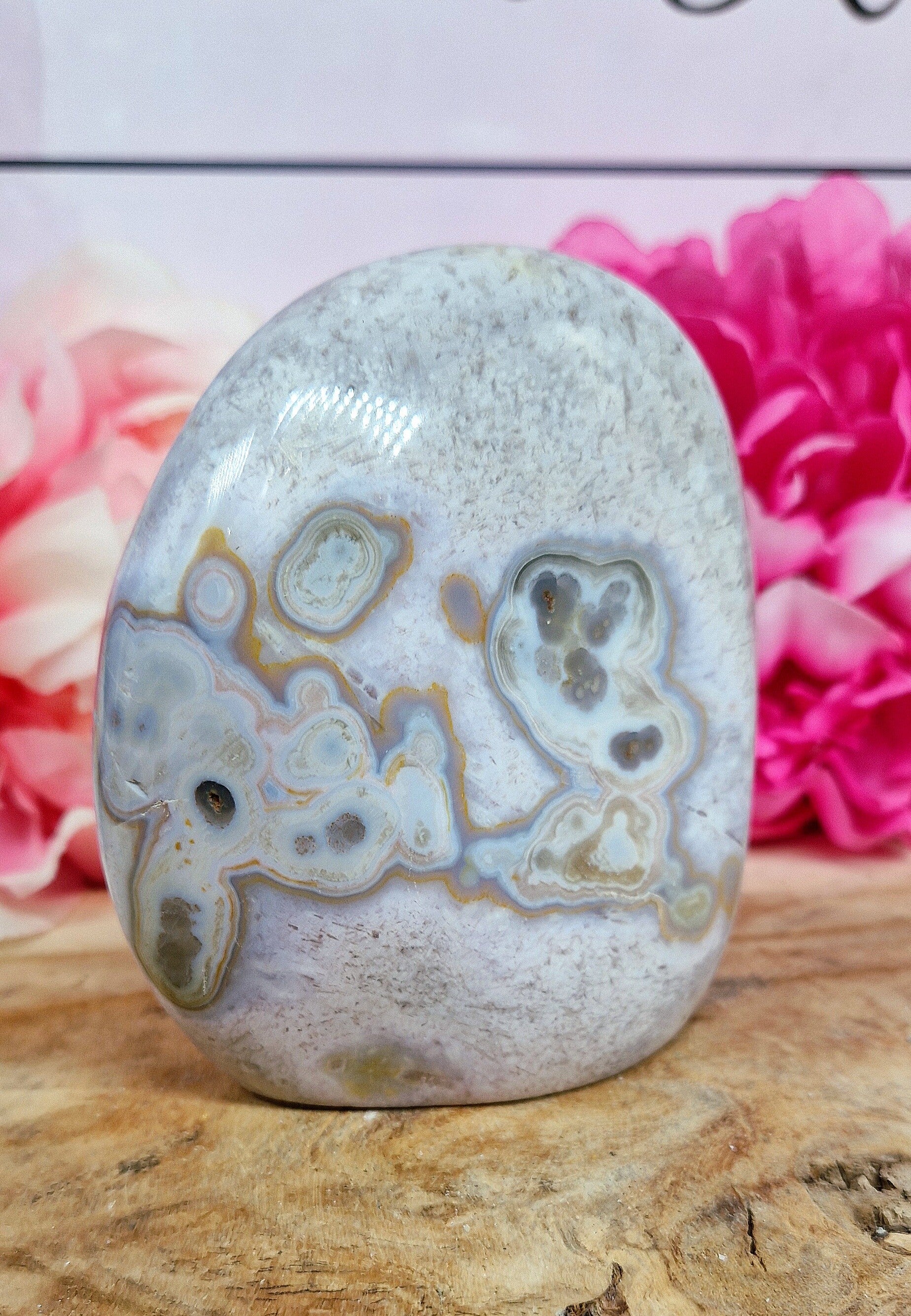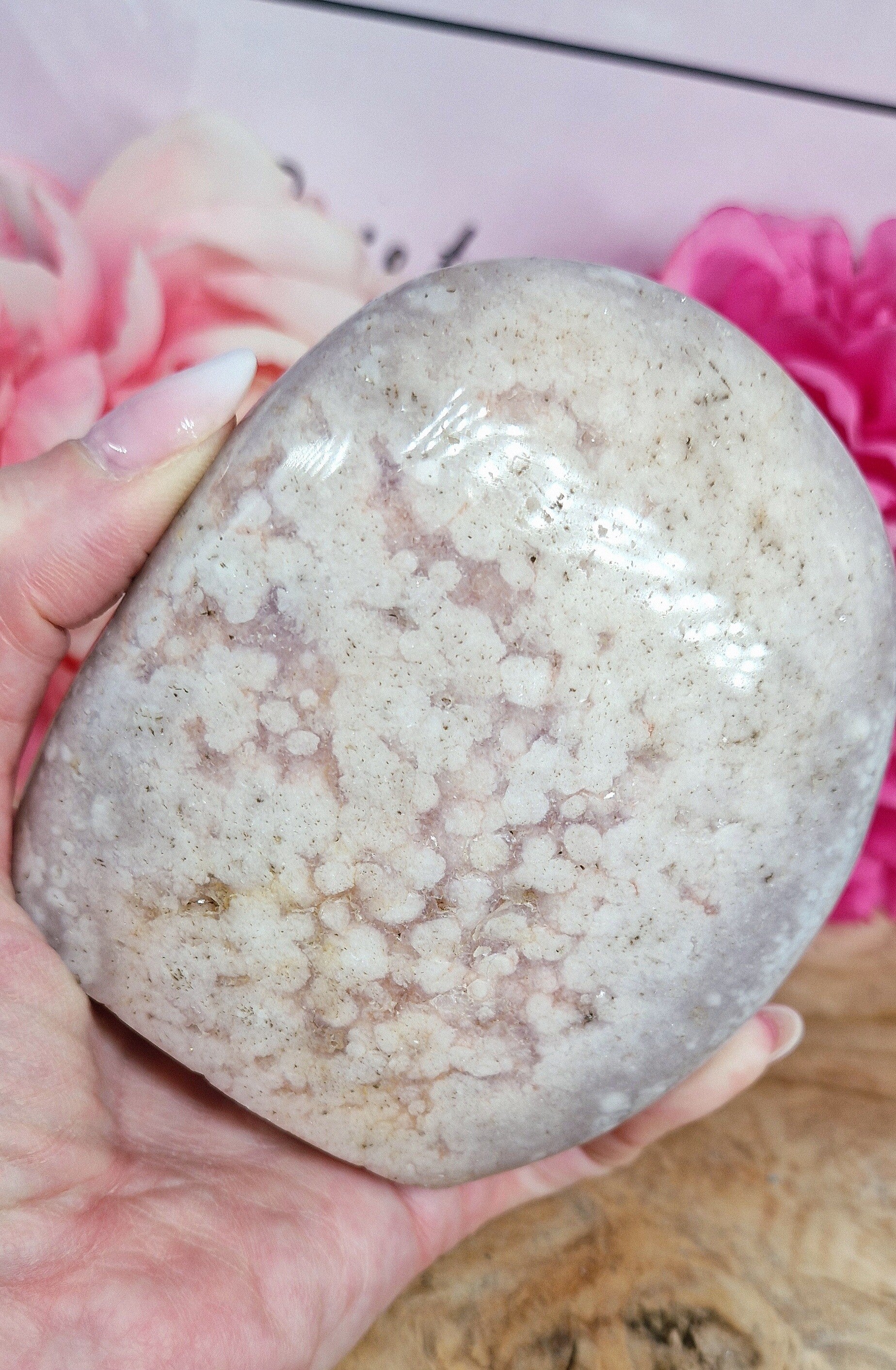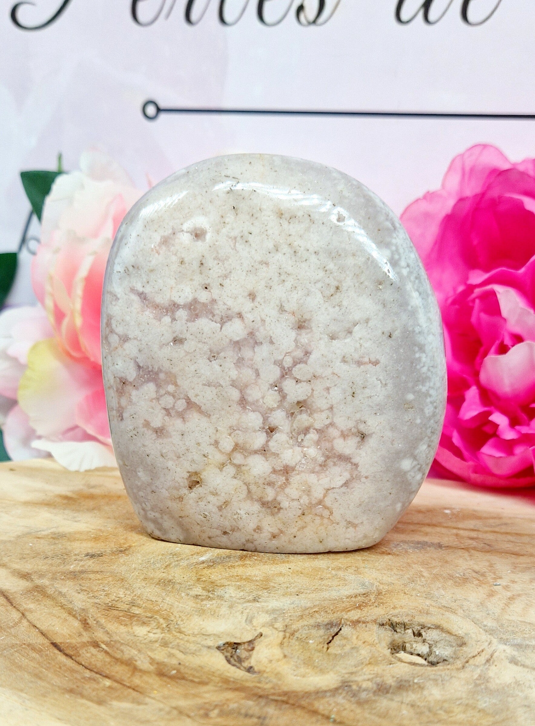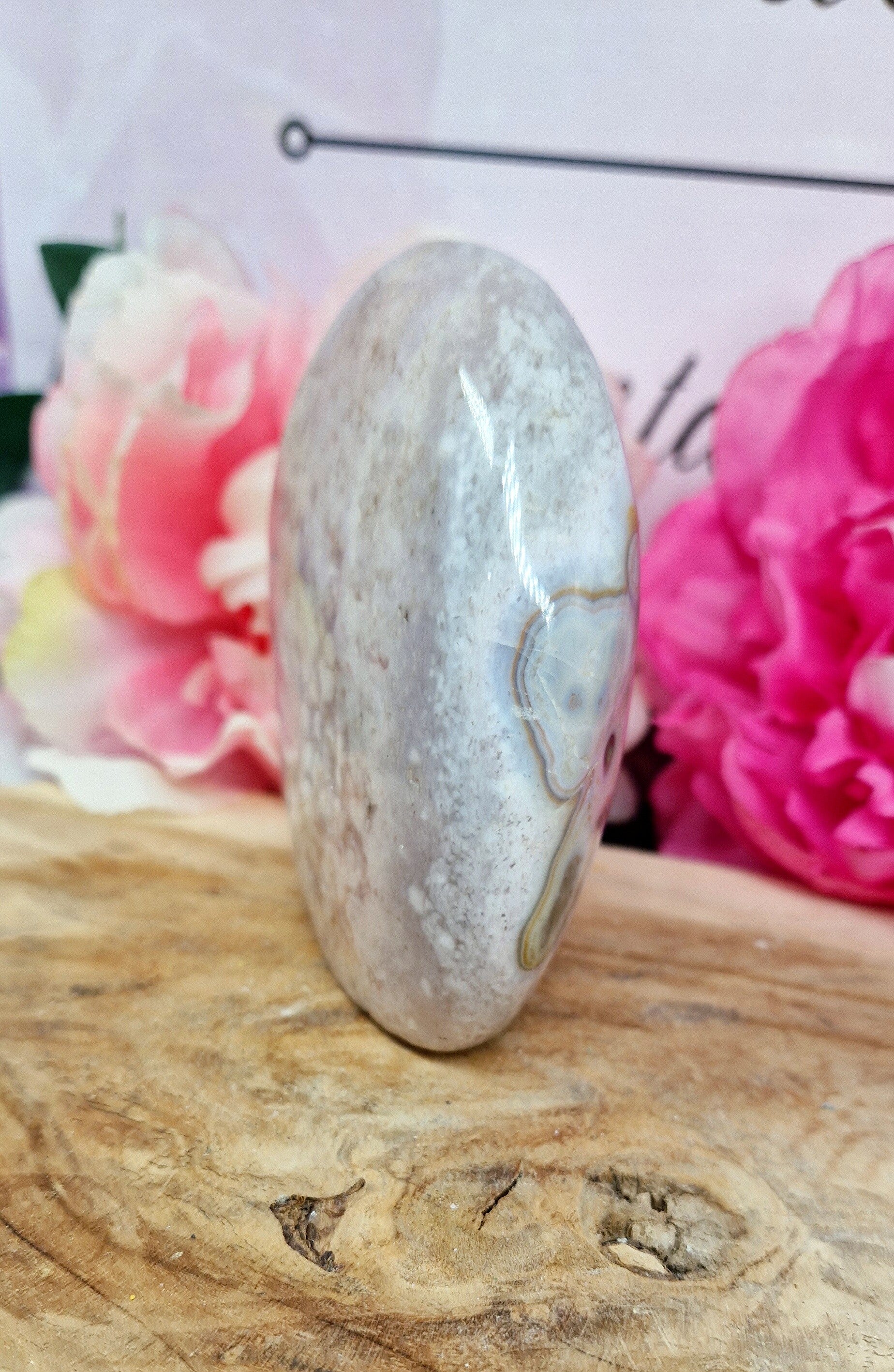 L’améthyste rose est une pierre de tendresse et d’apaisement, favorisant l’amour inconditionnel, la paix intérieure et la guérison émotionnelle. L’agate fleur, amplifie les énergies positives et soutient l’alignement spirituel.