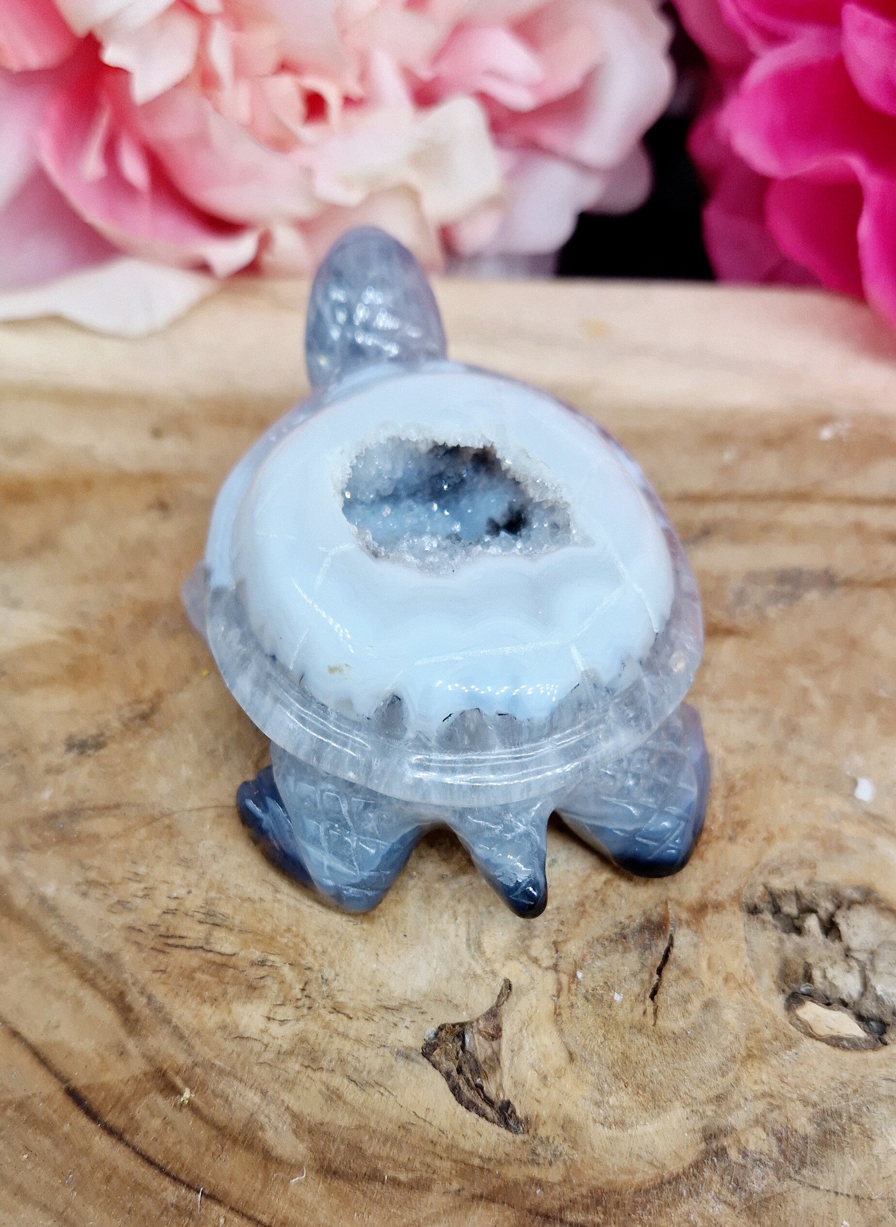 Sculptée dans une agate bleue cristallisée du Brésil, cette tortue de 9 cm sur 5cm révèle de superbes cristaux scintillants à l’intérieur de sa carapace. Chaque pièce est unique, mêlant douceur des formes et éclat minéral.
