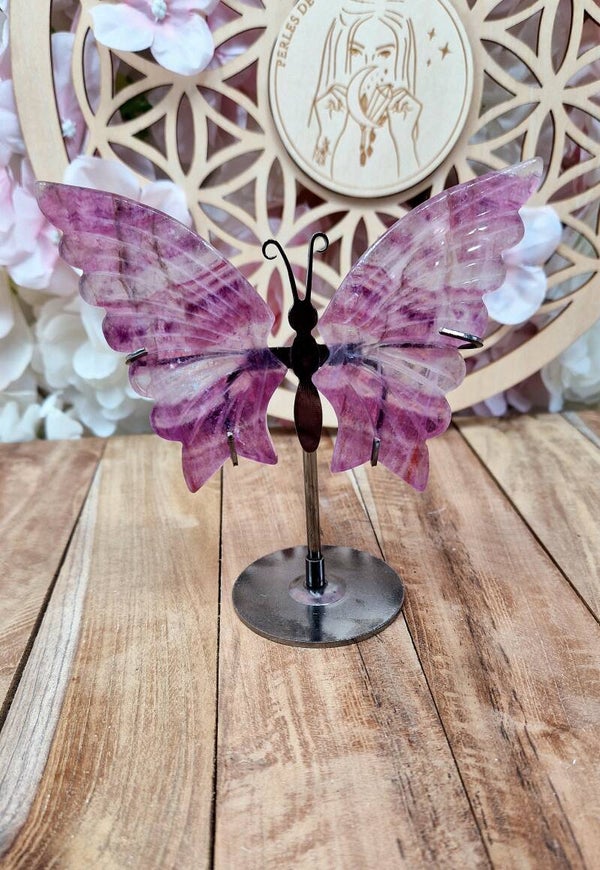 Papillon en fluorite sur socle métallique Élégance et énergie colorée