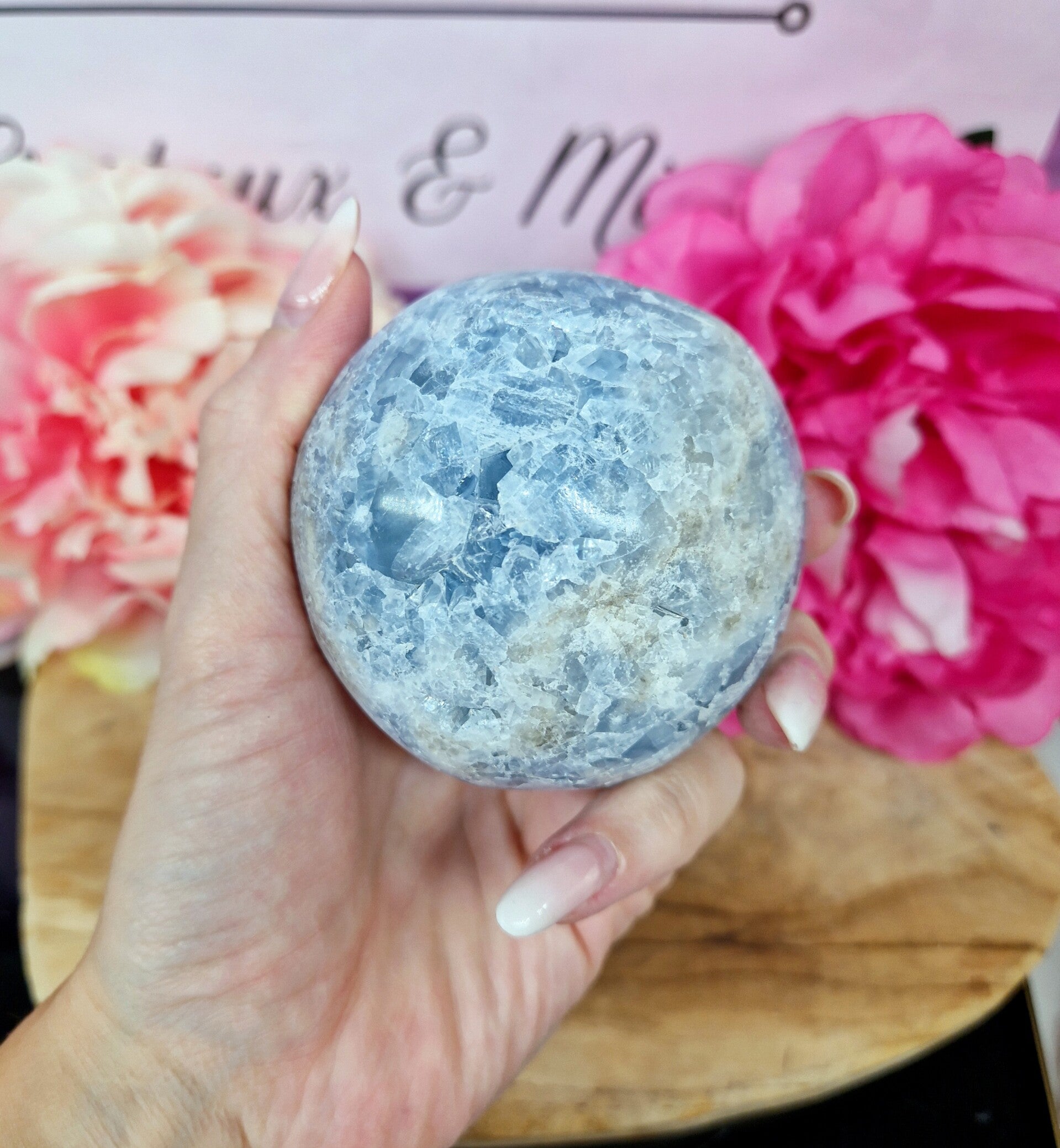 Magnifique druse de célestine en forme de sphère naturelle, aux cristaux bleutés apaisants. Cette pièce rare et élégante provient de Madagascar et mesure environ 7,5 cm de diamètre.