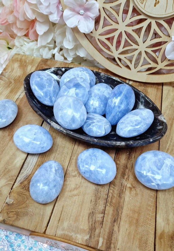 Ces galets de calcite bleue proviennent de Madagascar et mesurent entre 6 et 8 cm, ce qui en fait de belles pièces généreuses à garder près de soi ou à exposer. Leur teinte douce, allant du bleu pastel au bleu plus profond, invite naturellement au calme et à la sérénité.
