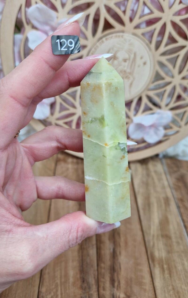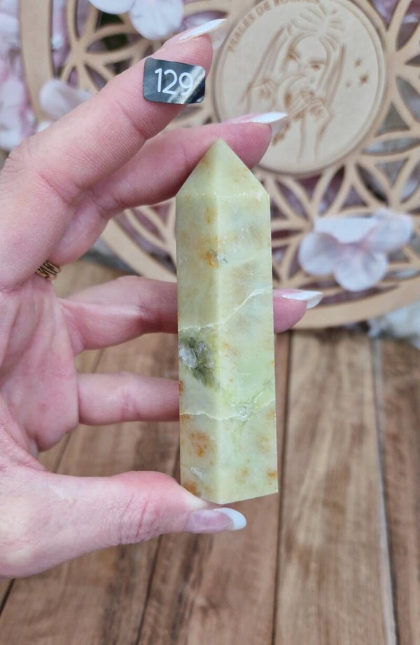 Magnifiques pointes de jade lemon taillées pour révéler leurs teintes douces vert clair.