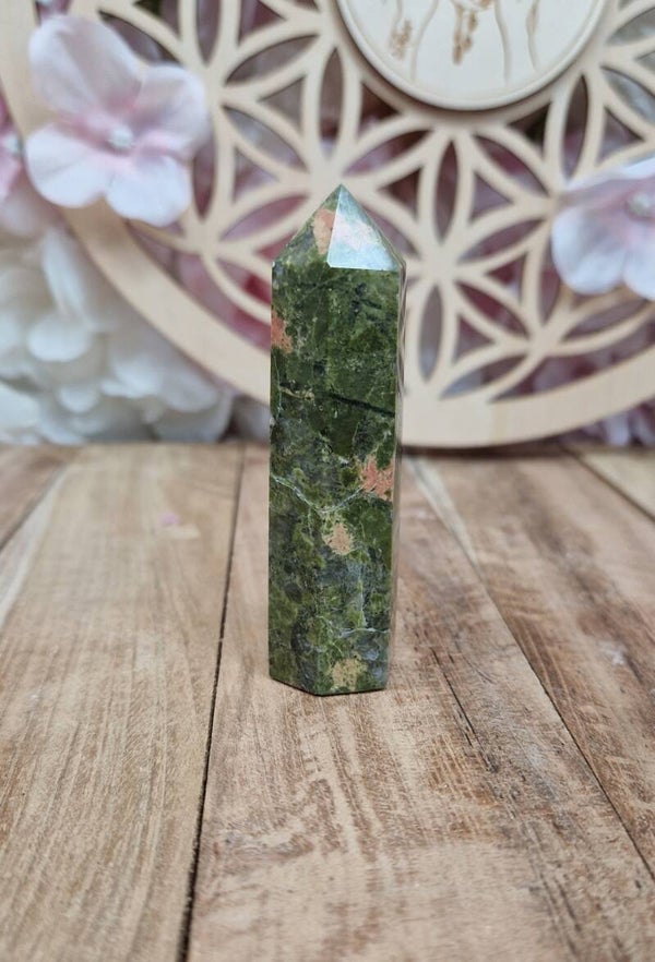 Pierre naturelle aux tons verts et roses, l’unakite est connue pour favoriser l’équilibre émotionnel, l’harmonie du cœur et la libération des blocages affectifs.