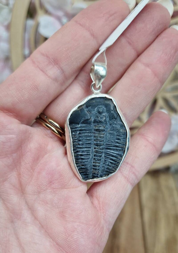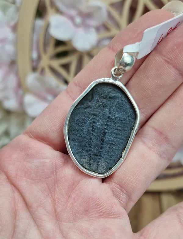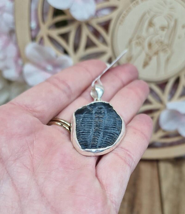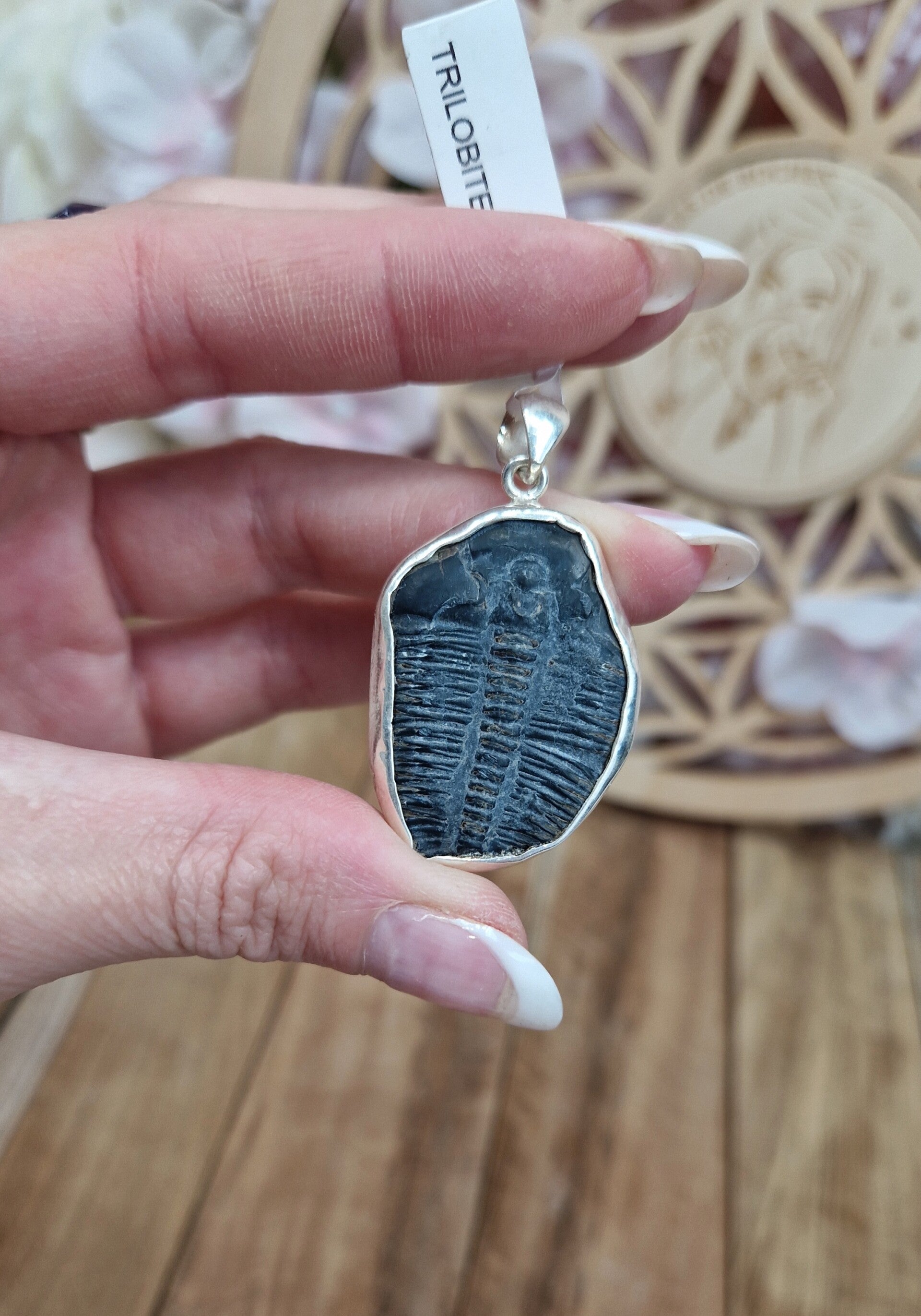 Bijou unique en forme de trilobite, symbole de sagesse ancienne, protection et énergie positive.