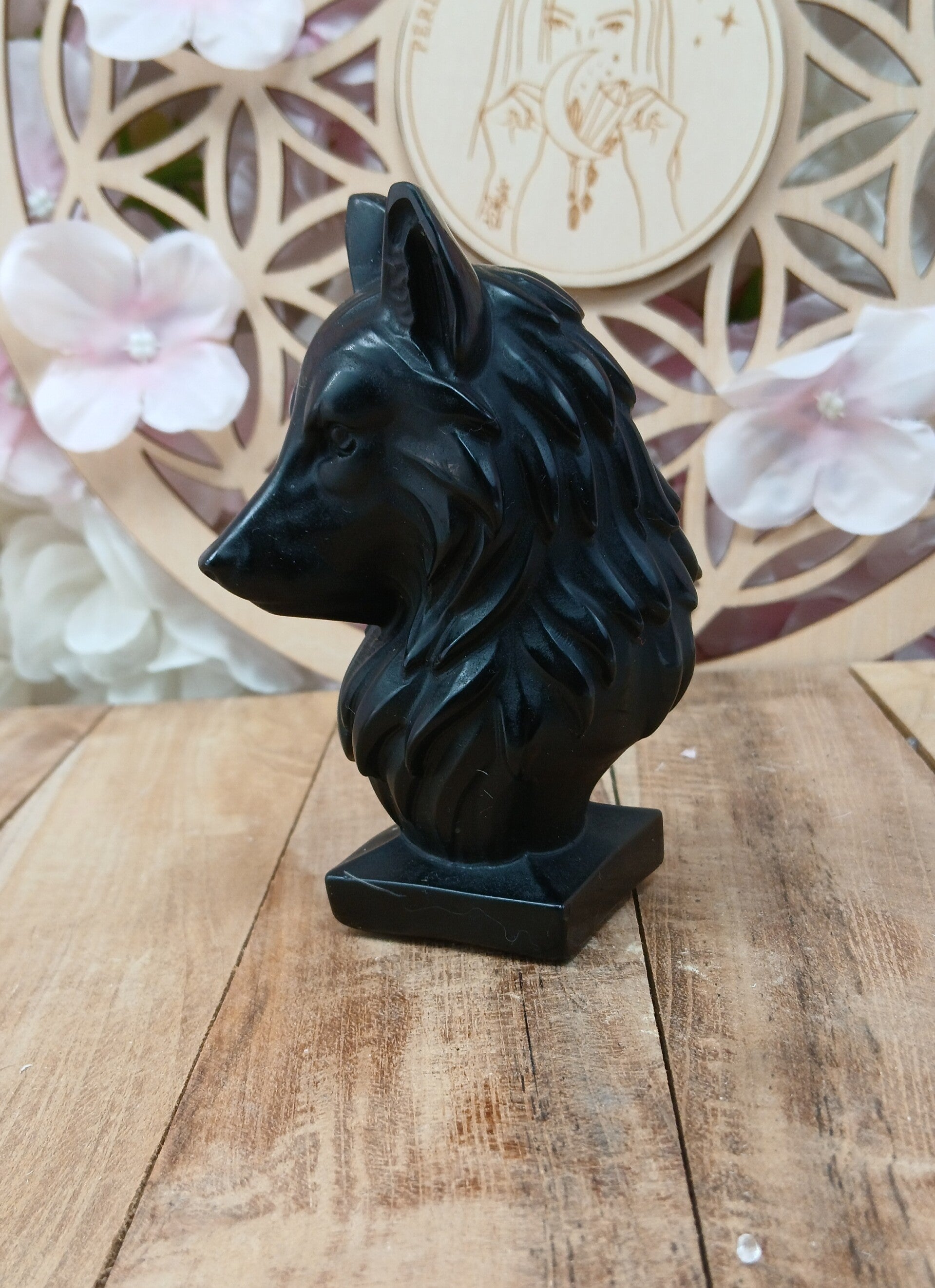Ce buste de loup en obsidienne noire naturelle est une pièce saisissante, alliant la puissance symbolique du loup à la profondeur et la brillance de l’obsidienne. Finement sculpté, il met en valeur les détails expressifs du visage et la force de cette pierre volcanique, chaque pièce étant unique.