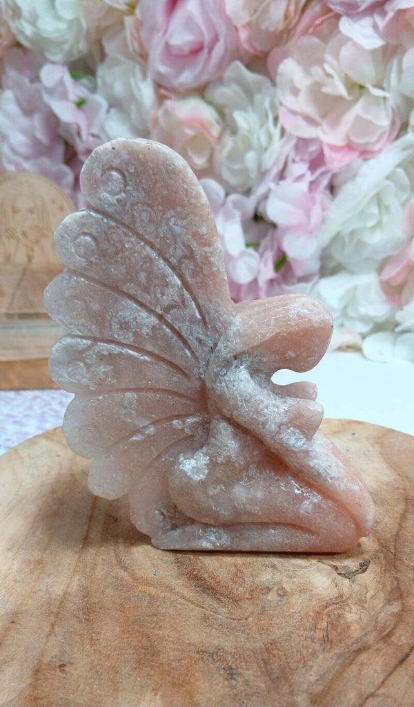 Cette fée en améthyste rose naturelle de 15 cm est une sculpture exceptionnelle, entièrement réalisée dans une pierre authentique aux nuances délicates et cristallines. Véritable pièce unique, elle constitue un objet de collection rare et une décoration minérale haut de gamme.